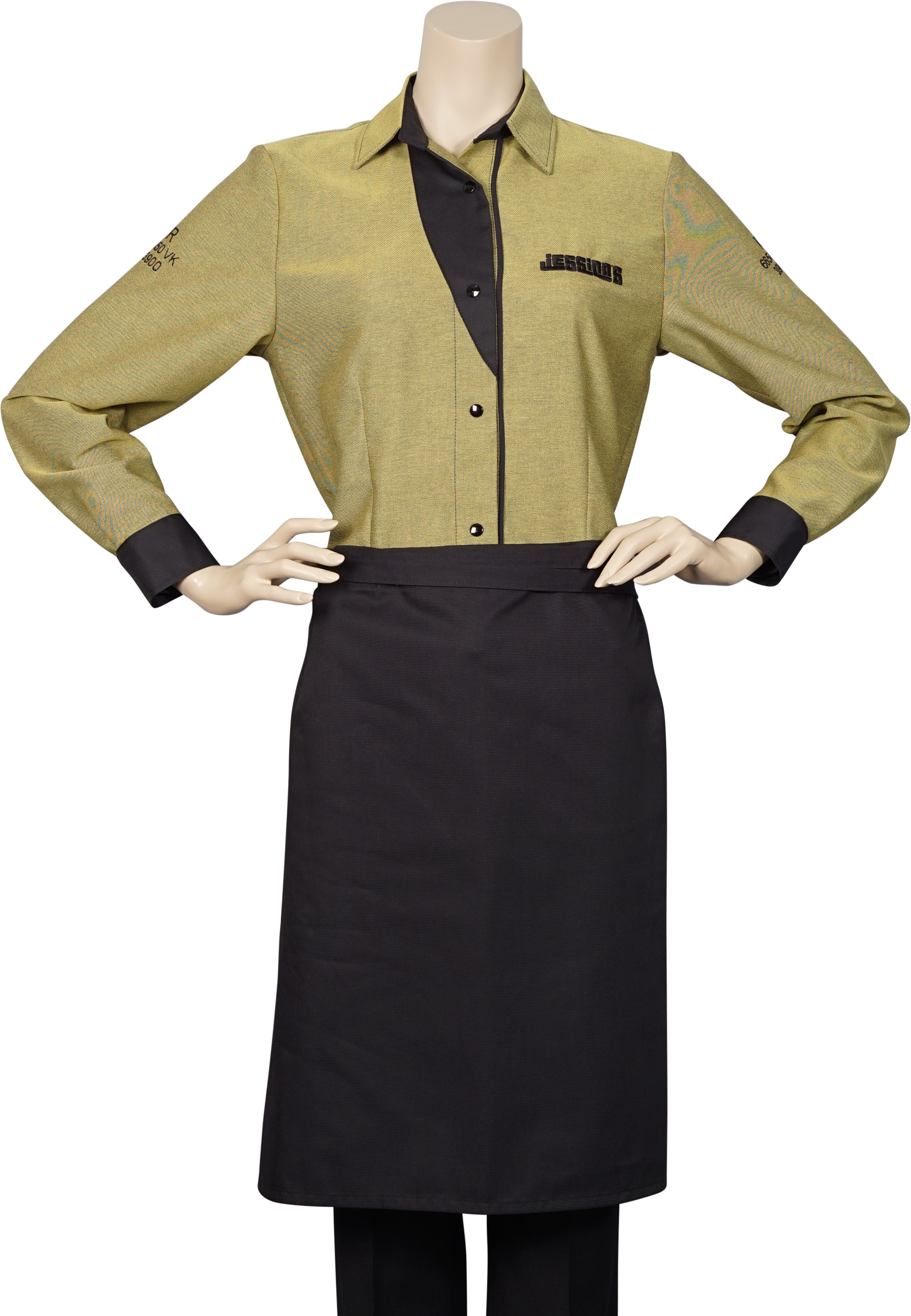 Eigentijdse olijfgroene damesblouse in jeansstof, model Juul met lichtgroene en zwarte accenten. Voor nóg meer draagcomfort is het rugpand gemaakt van een stretchstof die een optimaal werkcomfort geeft. Net zoals al onze stoffen voor bedrijfskleding, kan de stretchstof op 60° C gewassen worden. Door te kiezen voor een lichtgroene bistrosloof, wordt de accentkleur benadrukt die langs de sluiting doorloopt in de kraag. Kies voor een zwarte bistro sloof om het geborduurde logo te benadrukken. De in het zwart geborduurde bedrijfsnaam is stijlvol aanwezig en wordt subtiel versterkt door de zwarte drukknopen. Model Juul wordt met name toegepast door de traiteur, delicatessezaken en bakkers. Deze prettig zittende bedrijfskleding heeft een verfijnde uitstraling door de asymmetrische sluiting. Deze kleurcombinatie is een voorbeeld. Stem de kleuren af op jouw wensen, huisstijl en onderneming met behulp van de Unieke Zoetelief SKS Advies Methode.